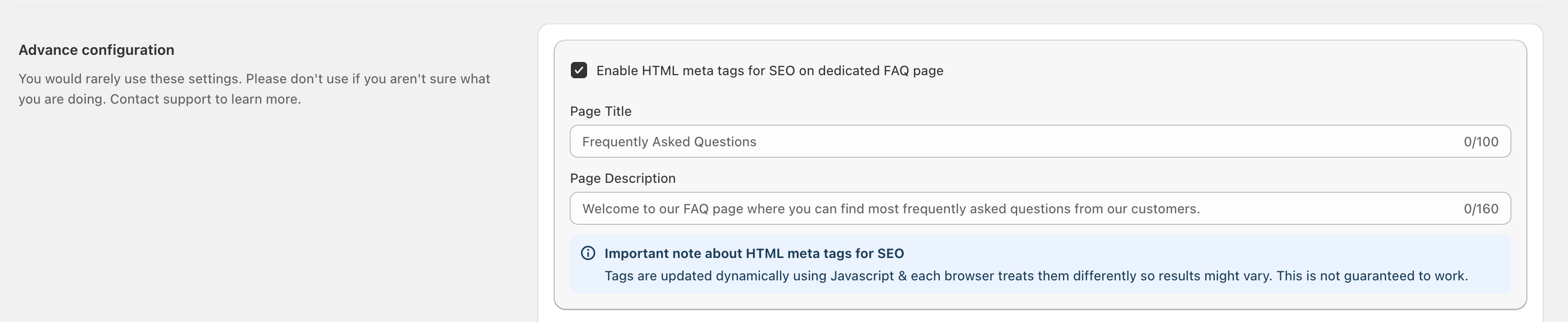 Simply navigate to "Settings" and then scroll down to "Advance configuration" option where you can see an option to enable SEO meta tags.